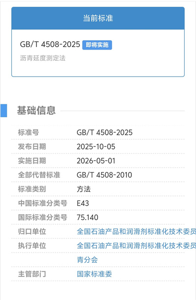 GB/T 4508-2025 于 2025 年 10 月 5 日發(fā)布,2026 年 5 月 1 日正式實施,全面替代 2010 版標準。此次修訂響應兩大核心需求:一是適配瀝青材料體系發(fā)展,隨著乳化瀝青、改性瀝青等新型材料廣泛應用,舊標準適用范圍已顯局限;二是接軌國際技術(shù)標準,修改采用 ASTM D113/D113M-17 (2023) e1 版標準,為進出口瀝青產(chǎn)品檢測提供統(tǒng)一技術(shù)依據(jù)。